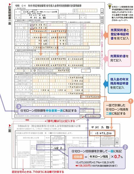 下図のように、住宅ローン控除額を計算明細書の二面で計算して、その金額を一面に転記しましょう。