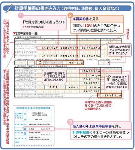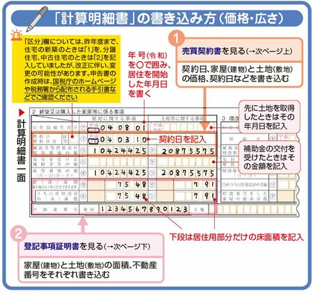 売買契約書と登記事項証明書の内容を、下図のように、計算明細書の「2 新築又は購入した家屋等に係る事項」に書き込みましょう。