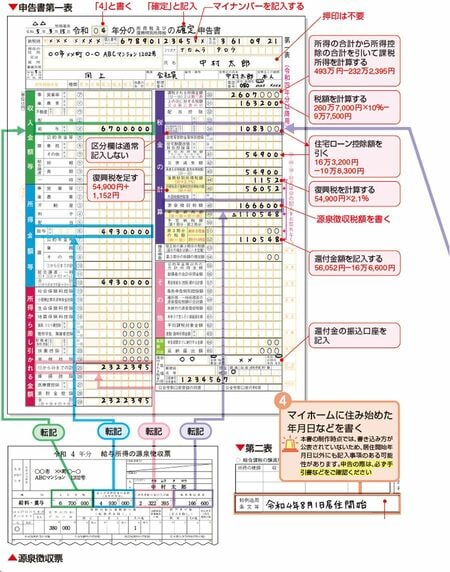 さらに、下図のように申告書第一表に計算明細書で求めた住宅ローン控除額を書きうつします。 第二表へは、居住を開始した年月日などを記入してください。