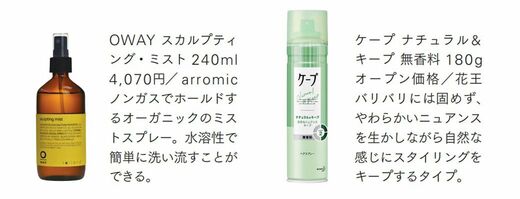細くなってきた大人の髪は、ワックスの重さに耐えられません。こまめに直しても、すぐ毛がねてしまいます。それに対して、「ケープ」などの髪型を固定するためのキープスプレーは、質量が非常に軽く、固定力も強い。スプレーの力だけでセットすれば、毛がヘタる心配は格段に減ります。