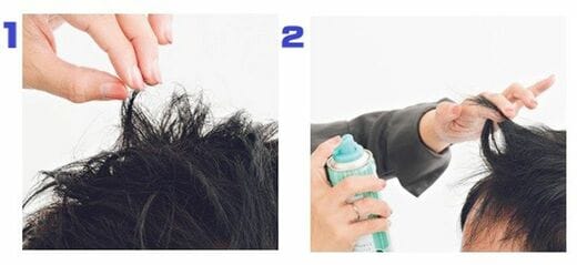 1、髪を持って立ち上げながら、根元に向かってキープスプレーを振りかける。髪の表面側でなく、内側からスプレーするとガチガチに固めたように見えず、キープ力も高い。