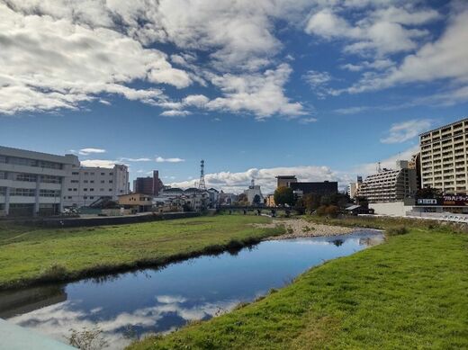 東家とブックナードの2つがあるのが、市内中心部を流れる中津川の東側・河南地区。「曲がりくねった川」と紹介された中津川は、秋になるとサケが遡上し、冬には白鳥が舞い降り、四季の移ろいを感じさせる。秋になると、橋から川をのぞき込んでサケを探す光景が風物詩にもなっている。