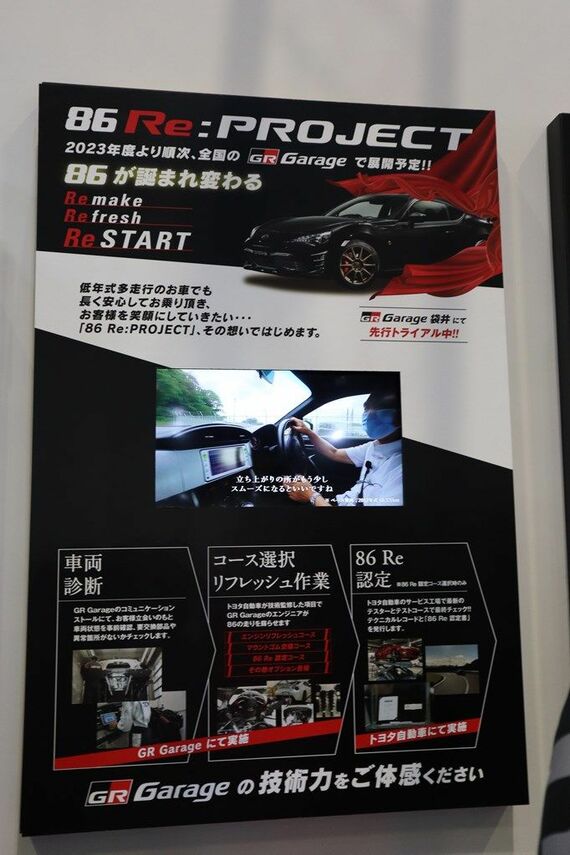 先代モデルの86も発売されてから早10年以上。エンジン内の部品や車体各部のマウントゴムなどが劣化している車両もある。当プロジェクトは、そうした車両について、車両状態の点検を行い、要交換部品や異常箇所がないかを確認。その結果をもとに、ユーザーと相談し、「エンジンリフレッシュコース」「マウントゴム交換コース」などのメニューを用意し、好みに応じた整備を行うというものだ。担当するのは、GRブランドのスポーツモデルやパーツの販売を行う店舗GRガレージ。現在は、静岡県のGRガレージ袋井のみでの運用だが、今後は全国のGRガレージ店で2023年内に随時開始予定だという。