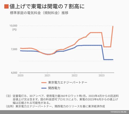 東京電力エナジーパートナーの場合、6月以降は標準家庭向け電気料金が月1万1737円(標準家庭の使用量260キロワット時)となる。これは関西電力の料金と比べて7割も高い。