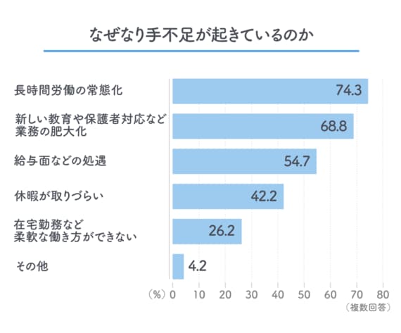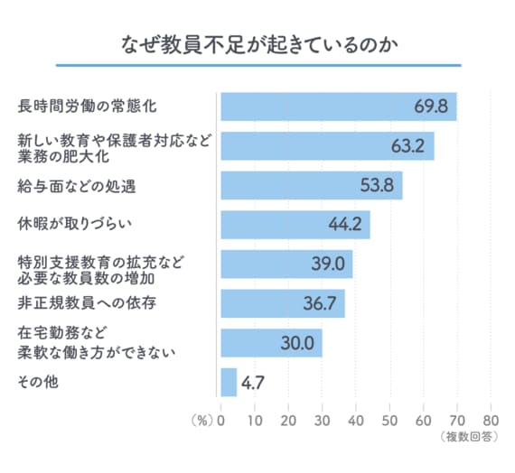 東洋経済新報社が小・中学校、高等学校の教員600人を対象に行ったアンケート調査では、教員不足、教員のなり手不足の原因(いずれも複数回答)は「長時間労働の常態化」とする回答が7割前後と最多だった。