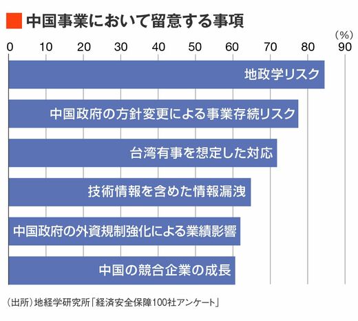 中国市場において意識するリスクとして、2021年に最上位だった「政府の方針変更による事業存続リスク」が今年は2番目に後退し、代わりに3番目に回答が多かった「地政学リスク」の回答率が63.6%から84.5%に増加して2022年は最多回答となり、順位が逆転した。