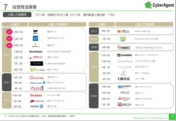 サイバーエージェントの投資育成事業は成績がいい(同社2015年9月期第1四半期決算説明会資料より)