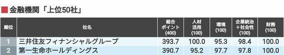 1位は三井住友フィナンシャルグループ。部門別でも人材活用1位、環境20位、企業統治+社会性5位といずれも高位だった。