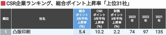 ここでは総合ポイント上昇率に注目。各年の上昇率を3年平均で計算してランキングした。1位は凸版印刷。総合74位でCSR得点を大きく伸ばした。