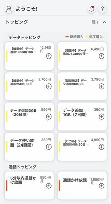 高速通信が必要な場合は、都度トッピングを購入する。トッピングには30日間有効な3GB(990円)や7日間有効な1GB(390円)などがあるが、バックアップ回線としていざというときに使うなら、24時間のデータ使い放題(330円)がお勧め。先のKDDIが起こした通信障害ほど長引くのはレアケースで、大抵の場合は1日以内に収まっているからだ。