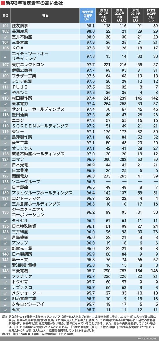 ビジネス #CSR企業総覧 前の記事 次の記事 「新卒社員の3年後定着率」が高い300社ランキング 女性の定着率が高い会社はいったい何が違うのか 5分で読める 公開日時:2023/02/28 05:00 伊東 優 東洋経済『CSR企業総覧』編集部 『会社四季報・未上場会社版』編集長 フォロー 1/10 PAGES 2/10 PAGES 3/10 PAGES 4/10 PAGES 5/10 PAGES 6/10 PAGES 次ページが続きます:【151~200位は?】 7/10 PAGES 8/10 PAGES 9/10 PAGES 10/10 PAGES