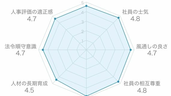 8項目すべてが4.5以上となっていますが、これは今年ランクインした企業の中でも唯一です。このように8項目すべてのスコアが高い企業を、私たちは「オールラウンド型」と呼んでいます。これはOpenWorkの中でも非常に珍しい形です。