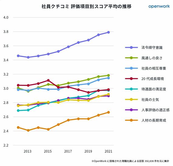 実はこの「20代の成長環境」は、OpenWorkの8つの評価ポイントのうち、この10年間で平均値が唯一悪化した項目です。