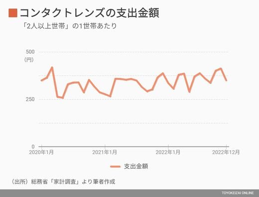 それに対して、各消費者の需要はどうなっているのだろうか。ここで各家庭における毎月のコンタクトレンズの支出額を総務省「家計調査」をもとに調べてみた。