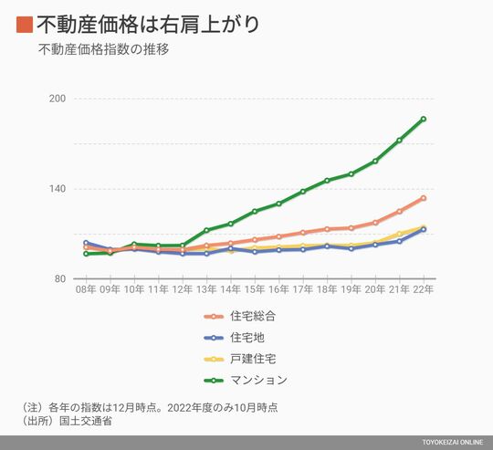 住宅地や戸建住宅はあまり変わっておらず、マンションの高騰が突出しています。とりわけ首都圏のマンションは、2020年頃まで「東京オリンピック後に暴落する」という予想もありましたが、今も高額の新築物件が飛ぶように売れており、中古市場を含めて引き続き堅調です。