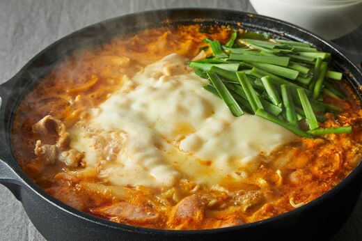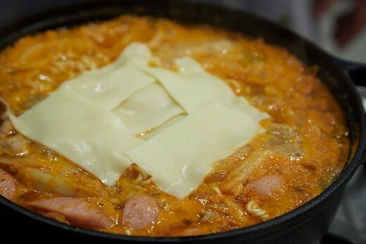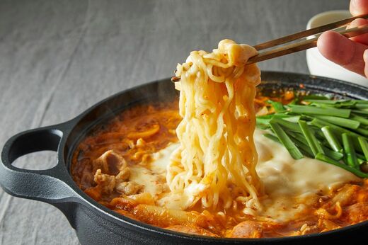 韓国のインスタントラーメンの麺にはじゃがいものデンプンが使われているため、日本の麺より太くてモチモチしています。これがまた鍋の汁とよく合うんですよね。仕上げに溶けるチーズをペッと乗せたら出来上がりです。