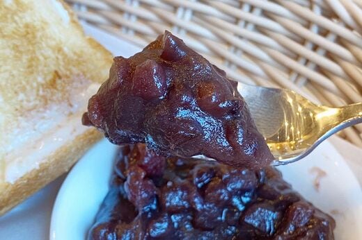トーストに全て塗ったらこの厚み。とろりと甘いねっとり感と、つぶあんならではのあんこのほくほく感も楽しみつつ、3.5cm厚のトーストとのハーモニーを味わえます。