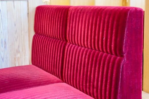 モットーは「街のリビングルーム」。赤いベルベット製のソファーはくつろげる店づくりの象徴でもあり、「コメダ珈琲店」のアイコンでもあります。イスが高かったり、硬かったりして長居に不向きな、他のカフェチェーンとは一線を画しています。