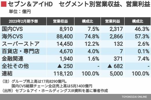 セグメント別業績予想をみると、セブン&アイはまさに巨大なグローバルコンビニエンスストアとなっていることがわかる。営業収益の8割超、営業利益のほとんどが国内、海外合わせたコンビニエンスストア事業に集中しており、このグループの祖業たるスーパーストア事業(イトーヨーカ堂など)は営業収益こそ12%程度を占めるものの、ほとんど収益貢献していない。