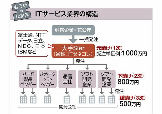 ビジネス #徹底図解 もうけの仕組み100 前の記事 次の記事 もうけの仕組み|ITサービス/ソフトウェア/スマホ/動画配信 ITサービスは重層下請構造、iPhoneの粗利率は5割強 2分で読める 公開日時:2023/03/05 08:30 有料会員限定 高野 馨太 東洋経済 記者 フォロー 松浦 大 東洋経済 記者 フォロー 西澤 佑介 東洋経済 記者 フォロー 森田 宗一郎 東洋経済 記者 フォロー 1/1 PAGES INDEX ITサービス|根強く残る多重下請け構造 ソフトウェア|SaaS化が安定をもたらす スマートフォン|アップルが得る粗利は5割強 動画配信サービス|コンテンツ投資回収に苦心 ITサービス|根強く残る多重下請け構造 コロナ禍でデジタル化の需要が急増しており、当面は堅調そう。大手SIerはシステム構築に加え、好採算なコンサルティング機能を強化している。一方、業界は元請け(1次請け)から2次請け、3次請けといったゼネコンのような多層構造で、下流に行くほどマージンが抜かれ採算性は低い。 この記事は有料会員限定です 残り 552文字 ログイン 有料会員登録