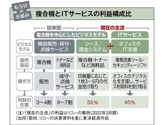 しかし、従前から進んできたペーパーレス化が、コロナ禍での在宅勤務で加速。安定収入を享受できた時代は終わりつつある。大手はこぞって事務機器の営業網を活かしたITサービス強化に乗り出している。
