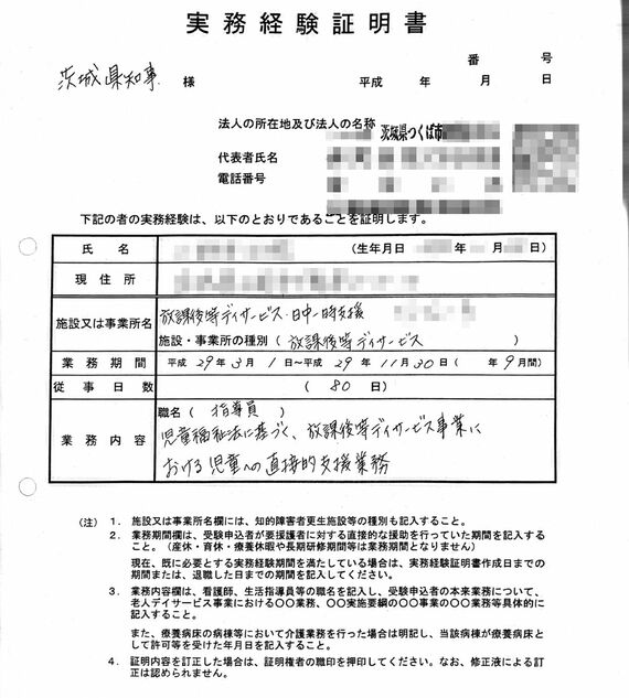 こどもプラス直営事業所の元職員のAさんは、神妙な面持ちでこう話した。Aさんが偽造したと証言する書類は「実務経験証明書」。2019年の初めごろ、当時、総合療育センターつくばで勤務していたBさんの名前と住所、総合療育センターつくばとは関係のない、つくば市にある別の放課後デイの事業所名、そこでの勤務期間などを手書きで記入したという。