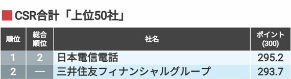 ここでは総合ランキングの基礎となる3つの部門(人材活用、環境、企業統治+社会性)の合計した得点による上位50社のランキングを紹介する。