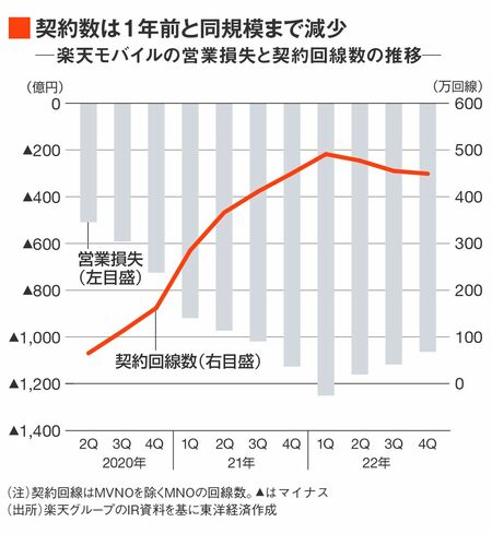 それも無理はない。楽天モバイルの2023年1月末時点の契約数は451万。2022年1~3月期をピークに減少へと転じ、2022年7月の「0円プラン」の廃止も、顧客離れに追い打ちを掛けた。単月ベースでは同年11月に底打ちしたものの、いまだ1年前と同水準にとどまっている。