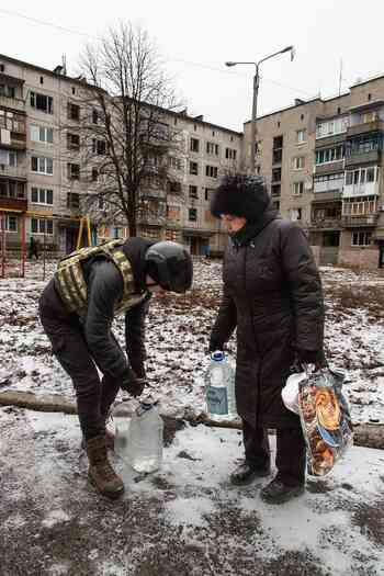 毛皮の帽子をかぶった女性がやってきた。大隊メンバーのサッシャから水が入ったペットボトルを受け取ると、涙ぐんでこう話した。