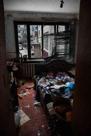女性が暮らす集合住宅の壁には砲撃で焼けこげた跡がある。砲撃を受けたばかりだという2階の住民、コリャ・ウガレフ(36)に部屋を案内してもらうと、キッチンにも寝室にも壊れた窓の破片が散らばっていた。