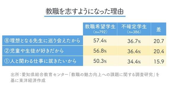愛知県総合教育センターの調査によると、教職を志した理由として、教員になることを希望する学生(教職希望学生)では、迷い中の学生(不確定学生)と比べて、「理想となる先生に巡り会えたから」に「とても当てはまる」と回答する割合が多かった。