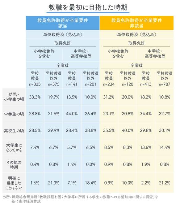 まず、教職を最初に目指した時期について見てみよう。浜銀総合研究所の調査によると、卒業後教員になる予定の学生の約5~6割が小中学生の頃(小学校以前を含む)で、高校生の頃も約3割でだった。