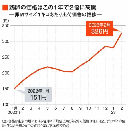 「物価の優等生」と言われてきた卵にかつてないほどの異変が起きている。鶏卵卸大手のJA全農たまごによると、卵Mサイズ1キロあたりの出荷価格(東京市場)は2月14日に335円と過去最高を記録。175円だった2022年2月の2倍近くに高騰している。