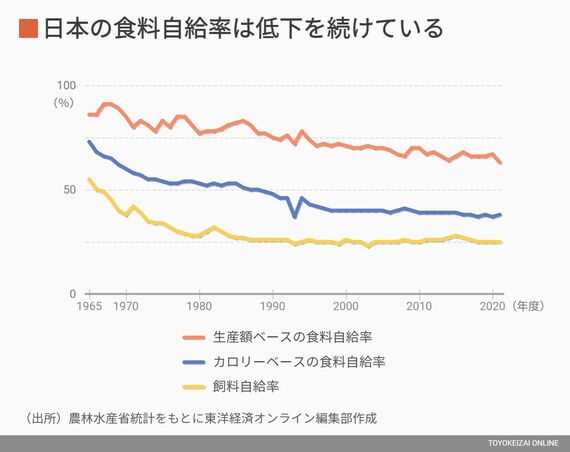 農林水産省の「知ってる?日本の食料事情2022」によれば、日本の食料自給率にまつわる数字は次の通りだ。