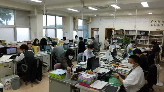 学習指導に関するところでは、学年内で共通理解が図れるよう、進路指導室や教科ごとに分かれていた教員の座席配置を学年単位に変更するなどの工夫も。学年内の情報や課題の共有が日常的に行われ、指導の目線合わせが容易になったという。