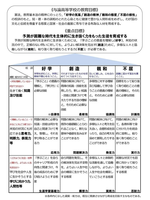 学習指導要領に定められた資質・能力の3つの柱と校訓の関係性を示した与論高校の重点目標