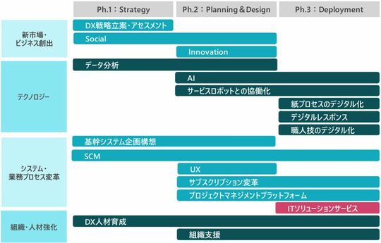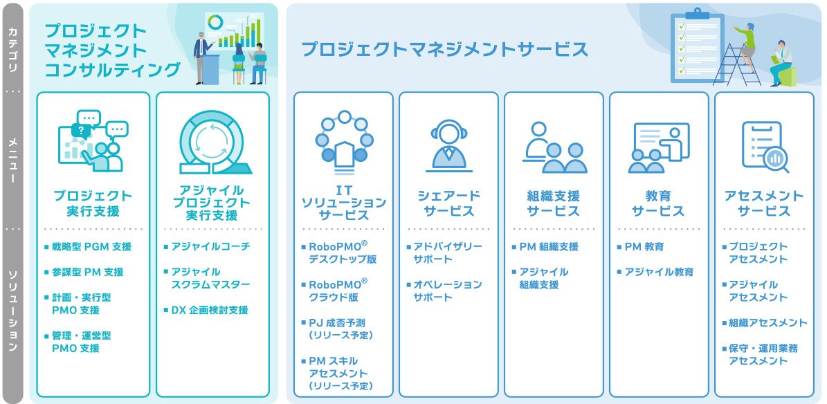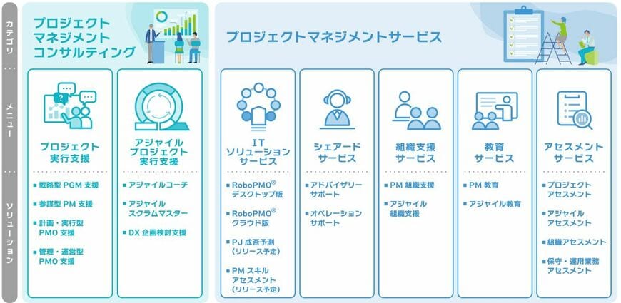 その結果を受け、ビジネスイノベーションユニットは18年から事業会社やSIerを対象にPMO支援サービスの本格的な展開を開始した。サービス領域は「プロジェクトマネジメントコンサルティング」と「プロジェクトマネジメントサービス」からなる2つの軸で構成され、プロジェクトの企画、計画、開発、運用保守の全てのフェーズ、また、実行支援から、組織支援、教育、アセスメントまでの全てのスコープについて、プロジェクトマネジメントの支援を実現する。