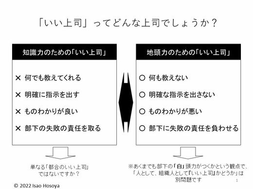 世にいう「いい上司」とは、部下にとって「都合のいい上司」にすぎないのではないでしょうか。都合のいい上司は、知識力を着実につければよい時代には確かに「いい上司」だったかもしれません。しかし、地頭力をつけようとするあなたにとっては、「いい上司」とはいえません。