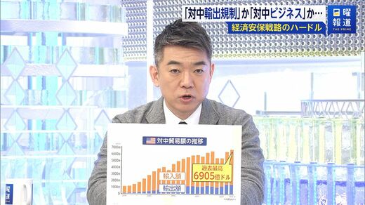 橋下徹氏(番組コメンテーター、弁護士、元大阪府知事):経済と経済安全保障はある意味相反するものだ。必要なところは規制をかけていくべきだが、米国がすごいのは、経済安全保障で中国に様々な規制をかけても中国との貿易額をどんどん増やしているところだ。日本も経済安全保障という形で様々経済行為に規制をかけるにしても、日本の経済が失速しないようにバランスを取らなければいけない。