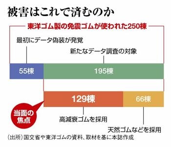 東洋ゴムは不適合品すべての交換に応じる方針だ。基準に適合する免震ゴムを作り、あらためて大臣認定を取得し直さないと、製品は納入できない。早期交換の実現には他社の協力が不可欠である。