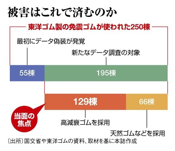 すでに不適合と決まった55棟について、東洋ゴムは3月30日、震度6強~7程度の地震でも建物の倒壊のおそれはない、という調査結果を発表。太田昭宏国交相は翌31日の会見で「震度7の最大震度にも耐えうることが証明されたのは意義がある」と述べた。