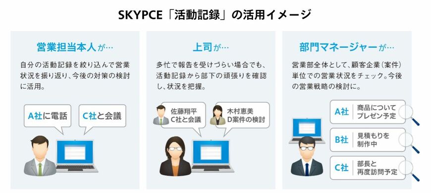 また、クラウド版のリリースと同時にアップデートされたSKYPCEには、新たに「活動記録」という営業支援機能が追加された。いつ顧客を訪問し、どんな話をしたかといった情報がメモできる。