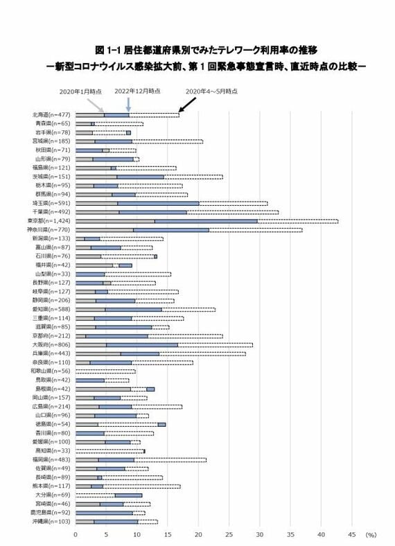 私は都市開発の専門家ではありませんので、ここでの持論展開は避けたいと思いますが、最後にヒントとなるデータを添えておきます。詳細は公益財団法人NIRA総合研究開発機構が慶應義塾大学と共同で2022年12月から2023年1月にかけて実施した第8回テレワークに関する就業者実態調査(速報)を参照ください。