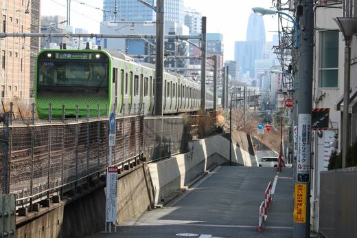 山手線の内回り電車は池袋を発車すると下り坂を進み、線路が堀割の中に入って目白に到着する。目白駅の南側では高い築堤の上を走り、できるだけ水平を保つようにして神田川を渡る。明治初期の弱い蒸気機関車の力に応じて、谷を渡って高田馬場へと至るため、勾配をゆるやかにするよう取られた線形だ。