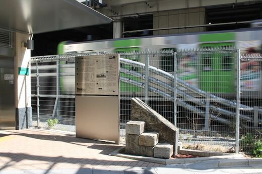だが、計画当初から駅用地には問題があったことがうかがえる。開業時の駅舎は清戸道から急な坂を下った、現在の山手線ホームや線路がある位置に建てられた。2020年に設けられたばかりの駅前広場と坂道の下を結ぶエレベーターの脇に、モニュメントとして階段の一部と説明板が設置されている。以前はここに使われていない階段があり、駅舎が崖下にあった頃の名残となっていた。