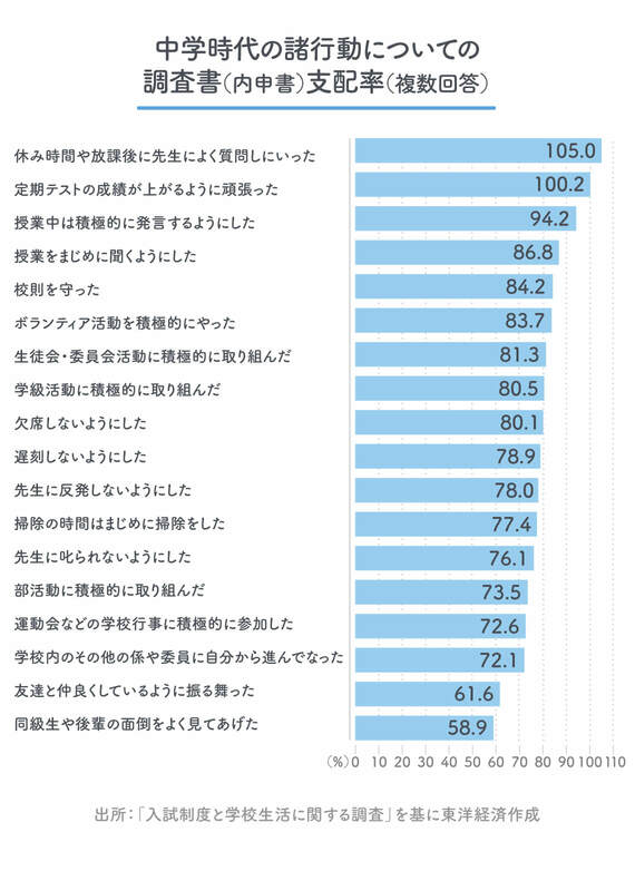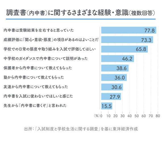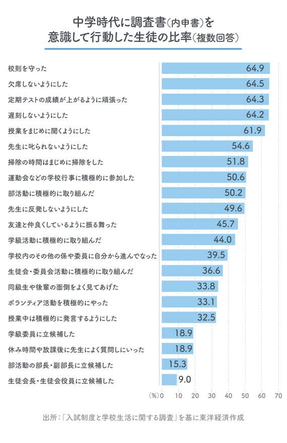 内申書をよくするために意識して取った行動について聞いた項目では、「校則を守った」「欠席をしないようにした」「定期テストの成績が上がるように頑張った」「遅刻しないようにした」「授業をまじめに聞くようにした」が6割を超え、学校行事や部活動、学級・委員会活動への積極的な参加を挙げた生徒が多かった。中には「先生に叱られないようにした」「先生に反発しないようにした」「友達と仲良くしているように振る舞った」という生徒がいたほか、内申書を意識して「学級委員に立候補した」が18.9%、「部活動の部長・副部長に立候補した」が15.3%、「生徒会長・生徒会役員に立候補した」が9%もいた。
