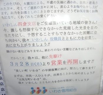福島県いわき市では、東邦銀行など地元地銀が損傷の激しい店舗を除いて、営業窓口を開いている。また、金融庁が3月11日に発表した「災害に関する金融上の措置」を受け、預金通帳、印鑑などを紛失した顧客には、本人確認さえできれば、預金引き出しに応ずるといった内容をわかりやすく説明したペーパーを用意、窓口業務を行っている営業店一覧を閉鎖営業店の玄関口に張り出すなど、来店客に混乱が生じないようにしている。損傷の少ない営業店は土曜、日曜日も窓口業務を行っている。