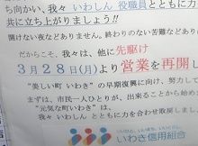 そうした中で、来店客は日を追うに伴って増えている。たとえば、いわき信用組合の平支店では、先週末25日には300名ほどの来店客があった。このうち、預金引き出しに訪れたのは150名程度で、残りの150名はローン返済などの相談に訪れた顧客だったという。