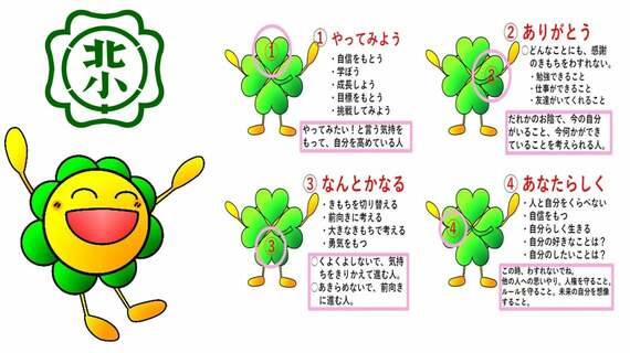 「幸せは、『やってみよう!』(自己実現と成長の因子)、『ありがとう!』(つながりと感謝の因子)、『なんとかなる!』(前向きと楽観の因子)、『ありのままに!』(独立と自分らしさの因子)の4つの因子を意識することでコントロールできるという理論です。これはウェルビーイングを高めるための心のあり方ともいえます。実は本校には、私が着任する前から、幸せのシンボルである四つ葉の校章から発想した『ひらっきー』というキャラクターがありました。これは運命だと思い、とくに児童には、ひらっきーの背中にある四つ葉のクローバーに『幸福4因子』を当てはめて伝えています」