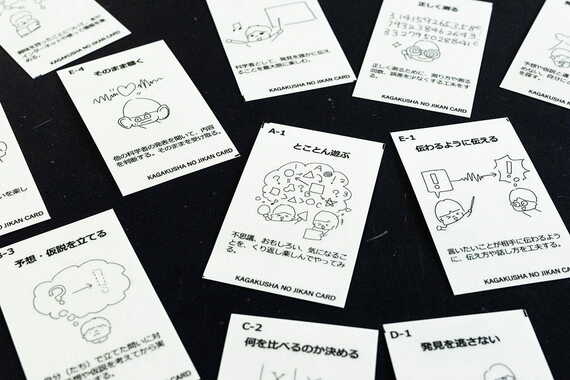 「問いの手がかりを探す」「問いを持つ」「観察・実験を行う」など5つのカテゴリーに分かれたカードには、イラスト(井久保氏が担当)と「何を比べるか決める」「正しく測る」など探究活動を行うときに大切にしたいことがシンプルな言葉で記されている。